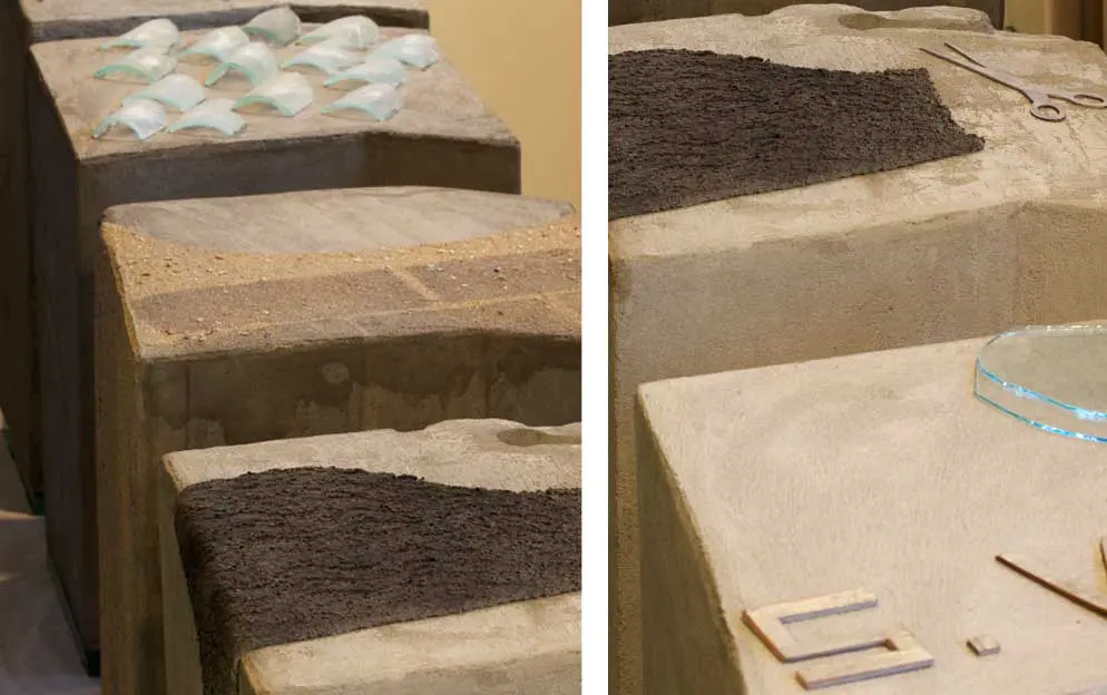 Í verkunum á sýningunni Vörður leitar Jónína Guðnadóttir (f. 1943) aftur til bernsku sinnar og mótunarára um miðja síðustu öld. Hún finnur hugmyndum sínum form í skúlptúrum og veggverkum þar sem saman fara fjölbreyttur efniviður á borð við steinsteypu, gler og leir.